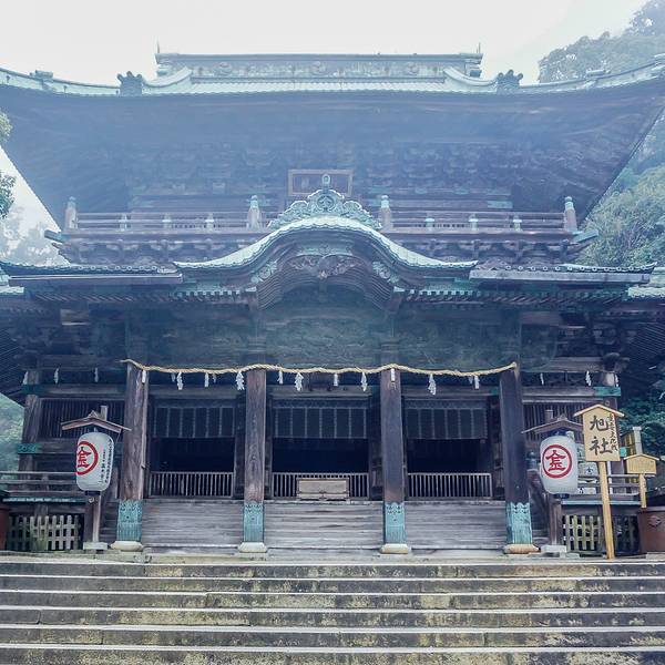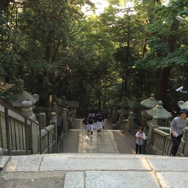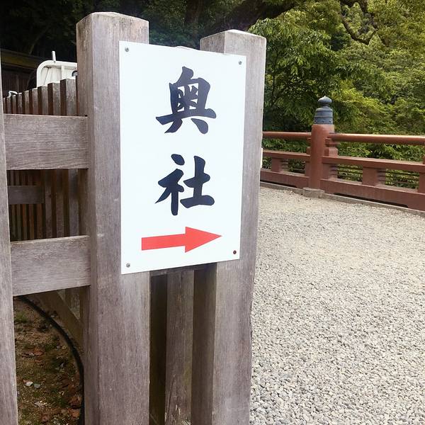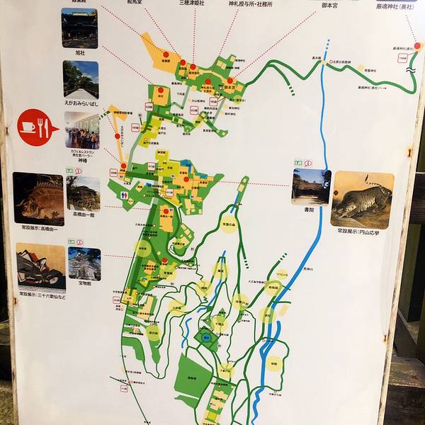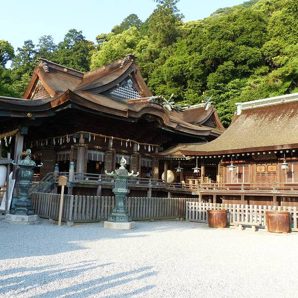参拜道的长石阶甚为有名,登至内社(严魂神社)共有1368级。登365级即到“二层入母屋造”结构的大门。从大门向前即是神社院内,至此可以像江户时代那样乘坐石阶抬轿。到大门之前的道路两侧,土产店、饮食店等鳞次栉比,还出租拐杖。穿过大门则排列着撑着大伞的5家点心店“五人百姓”,是由于先祖的功德而被特许在神社院内营业的具有历史的小店。沿着石阶向上攀登,柱间和门扉上刻着美丽雕刻的旭社、室内用圆山应举和伊藤若冲的障壁画加以装饰的书院等的正殿、宝物馆、鸟居等数个遗址、看点接连不断,登785级即到本宫。