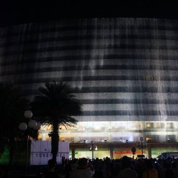 位于市中心中山路上,不远处就是榕杉湖以及日月双塔,依仁路美食街就在旁边。这里是市区难得的一处大型露天广场,而我们去的时候正值五一节搞商家活动,临时展览占据了大部分地方,而来这里的目的,大多是为了晚上8点半,在广场东南角的漓江大瀑布饭店的“放水”演出。伴着音乐,瀑布从楼顶倾泻而下,历时约12分钟。气势有了,但感觉灯光的色彩不够丰富。