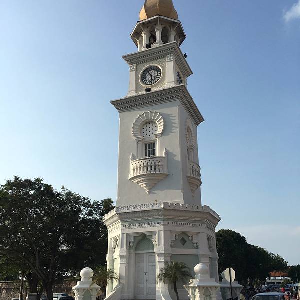 钟楼高60尺,每一尺代表1年,所以60尺就代表维多利亚统治了英国60年。该钟楼的修建历时5年,于1902年女皇维多利亚逝世前一年(1901年1月22日逝世)竣工。目前这座钟楼因为在二战时期受到空袭的关系,已稍微倾斜。在夜晚彩色灯光映照下,钟楼又有不同于白天的观赏效果。观看过李安导演的《色戒》这一部电影的,肯定会对王力宏、陈冲等大明星漫步在叶祖意大厦和税关局大钟楼之间的旧街景片段留有印象。背景上的钟楼就是槟城街头著名的旧关仔角钟楼。