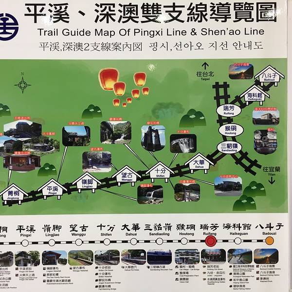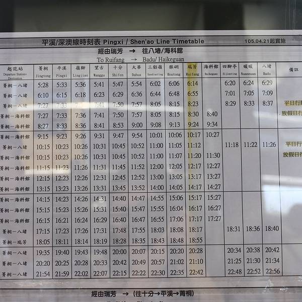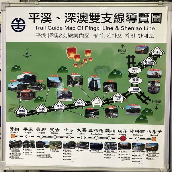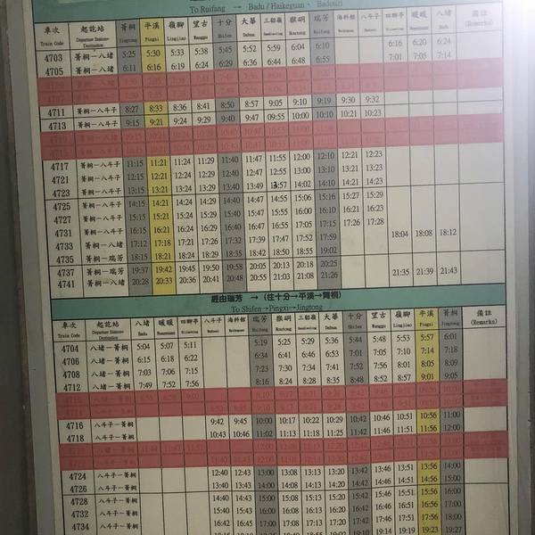 到达瑞芳后,先不去九份,可以在火车站寄存行李,可以寄存到晚上8点,平溪一日小火车游后再来拿行李。 平溪小火车:计划一直坐车到菁桐(终点站),再倒着玩回瑞芳,根据个人喜好选择车站下车进行游玩,小火车大概1小时一班,所以注意时间上车。买了一次票,后续上车都是免费的。这是每个站的路线图和经典景点这是一个时刻表,可以参考上下车等待火车的到来