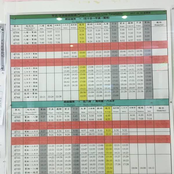 花莲-瑞芳 计划: 平溪线:菁桐站-平溪站-十分站-猴硐 九份老街 第6天的行程依旧排得满满的,所以我不得不一早就出发了,从花莲到瑞芳最早的两班车分别是6点07分出发,8点52分到的605次车和7点27分出发,9点07分到的207次车。台铁最早的预定时间为提前14天,就晚了1天,没有订到7点27分的那班,只好一大早起来赶火车,说多了都是泪啊。tips:花莲到瑞芳的最开始的一段路上一路都是海景哦,如果不是像我这样起太早需要打瞌睡,建议好好观赏,心情好还可以拍延时摄影,反正这次我错过了,哎~ 到达瑞芳车站后第一时间就是寄存行李,火车站出门右转就是,寄存一天需要50台币,只能保留到当晚的8点,超过时间就要第二天拿且加算一天的费用。然后就是购买平溪线的一日票,当然不买票刷悠游卡也是可以的,一日票80台币,悠游卡一站30台币,因为一般要游览好多站,一般建议购买一日票最划算。另外就是每个站之间的班次都是固定时间1小时1班,所以如果还要去九份的话一般一天最多游览3-4站。下面是时刻表给各位参考。平溪线的线路图我选择的是直接坐火车到菁桐从菁桐开始往回走的路线,因为整条平溪线最火的就是十分,这样可以保证最开始的几站错过人群高峰。(十分车站无论往哪个方向几点都是人潮汹涌,有种国庆国内热门景点的赶脚- -#)