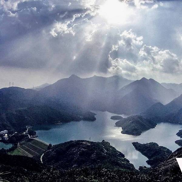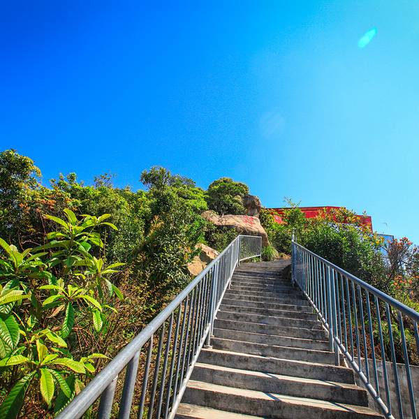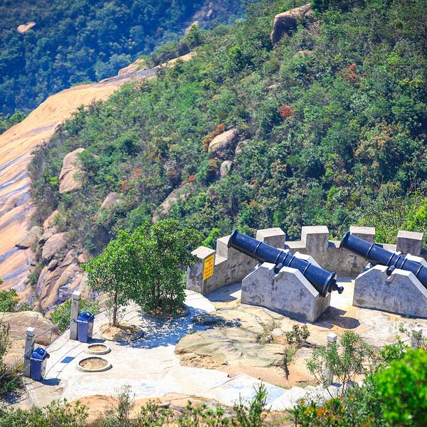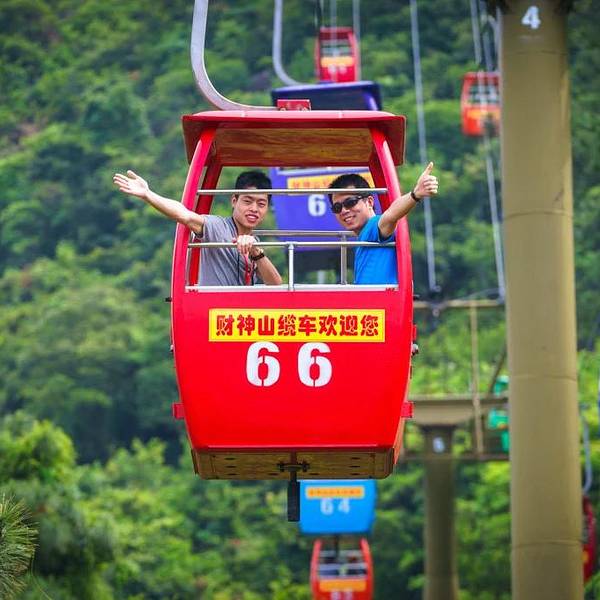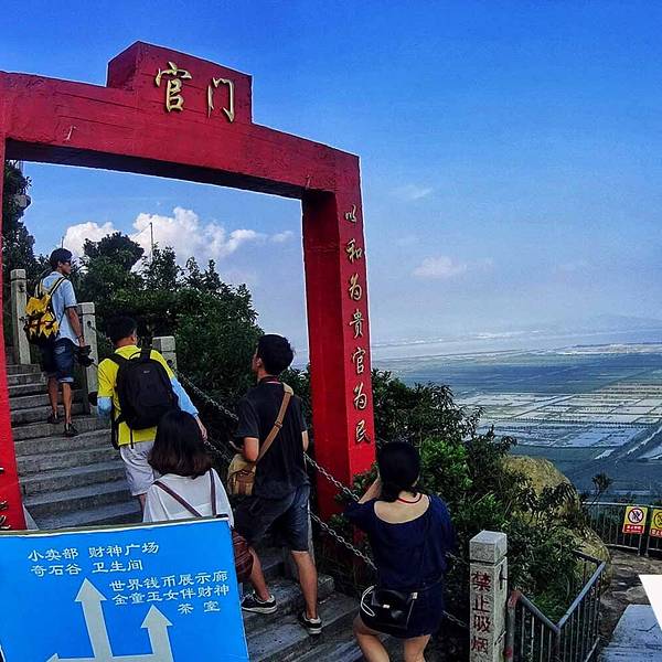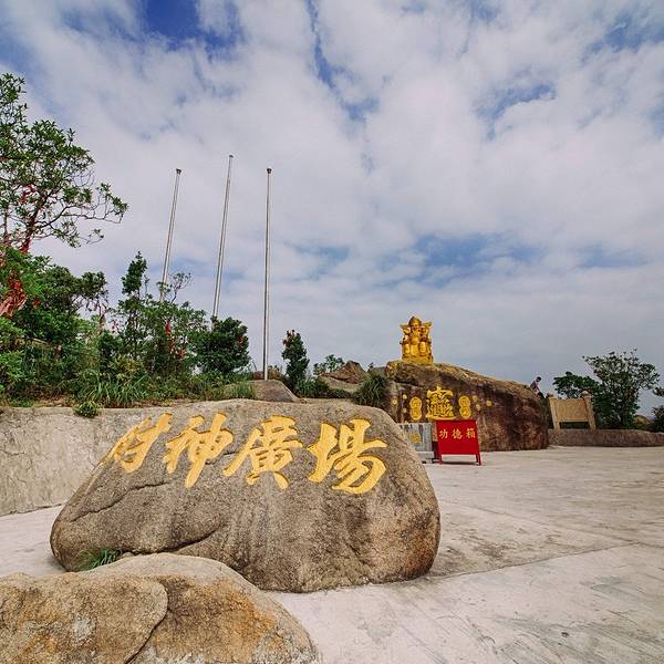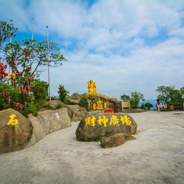 财神山顶有古代崖门战场遗址,至今还能収寻到古炮台及古战壕等历史遗迹,除此之外,千姿百态、美不胜收的奇峰怪石,古朴挺拔、苍翠浓郁的原始密林更是为财神山增添了一层神秘的色彩。晴朗之际,挟着丝丝清爽的凉风,站在高高的财神山顶,东看围垦良田阡陌、海天一线;西看东方红水库湖水澄碧、波光嶙峋;南看度假邨平湖荡舟、湖河相济、飞瀑流泉、怡桥观鱼、华舍幢幢、中西合璧、车马如梭、游人如织;北望崖门青山挟海、渔帆点点、鸿桥高架、古炮沉寂。放眼四望,很是令人豁然开朗、心旷神怡,使人顿生“水到无涯天作岸,山临绝顶人为峰”的高远意境。