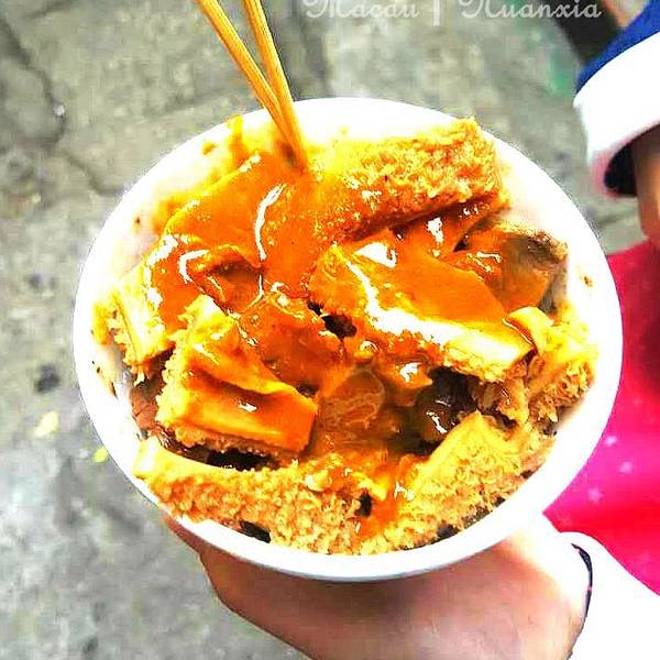 ▲锦记牛杂是我要强烈推荐的小吃,从大三巴牌坊的台阶走下来,顺着右边的小路走一会,就到了,路交叉口有锦记的牌子,可以顺着牌子走。隐藏在小巷里的小小店铺人气很旺,总是排着长队。老板很帅很有魅力也很有亲和力,动作娴熟,光是看他从汤汁里捞起牛杂剪成块就已然激动不已。牛杂淋上一大勺咖喱,热腾腾,香喷喷,我们就这样站在小巷里吃着,一边吃,一边称赞,60年的古法烹制果然名副其实。萝卜牛杂分小中大三种,小份35元,中份45元,大份55元,港币、澳门元、人民币三币通用。我们都点了中份的,分量一人吃足够。不够还可以另外加菜。 排队的时候不知是哪家店铺的人冲着锦记大喊了一声“牛杂不好吃,来吃丸子”。锦记长长的快要排到巷口的队伍纹丝不动。一家店若是排队一定有它值得排队的理由,而真正的美食永远不怕等。