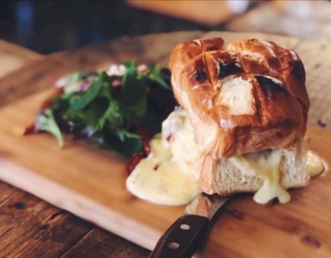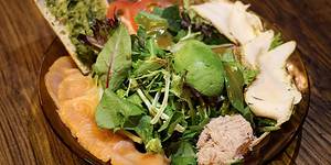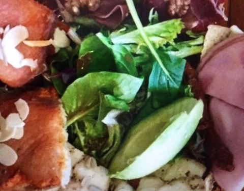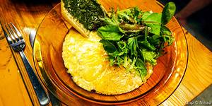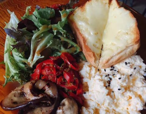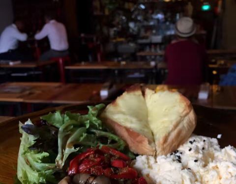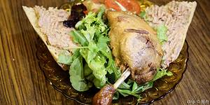 很老式的门面,法国人开的餐厅,比较浪漫,而且做事很认真执着,菜色选择多,汉堡很大一份,沙拉有很多不知名的蔬菜,除了咖啡还有酒,菜放木板上,很占地方喔。