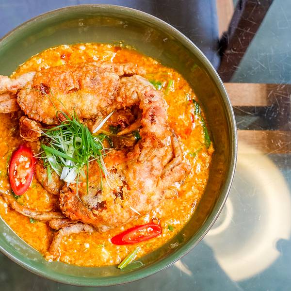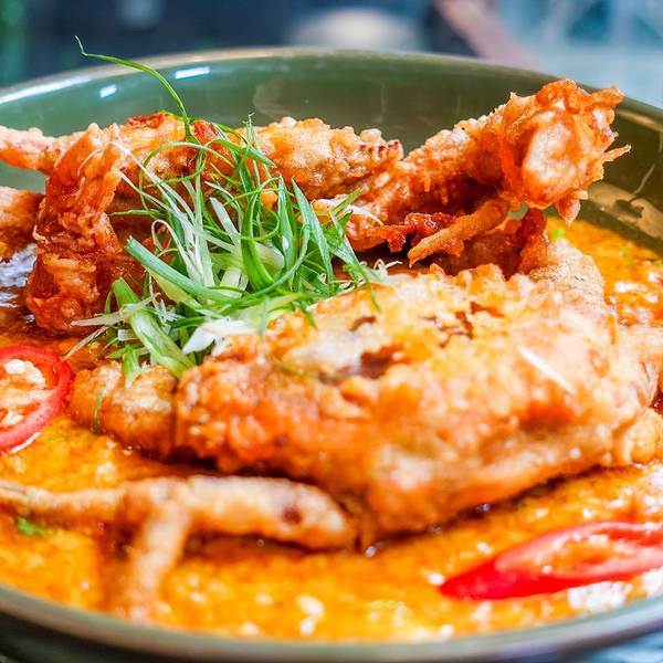 曼谷落地第一餐,廊曼机场一下飞机就打车过来了,由于是周末晚饭时间,太堵了,开到餐厅已经两个多小时过去了,还好没有超过预约时间,因为看了点评说户外就餐蚊子不少就约了室内靠窗的位置,感觉相当好。餐厅位...曼谷落地第一餐,廊曼机场一下飞机就打车过来了,由于是周末晚饭时间,太堵了,开到餐厅已经两个多小时过去了,还好没有超过预约时间,因为看了点评说户外就餐蚊子不少就约了室内靠窗的位置,感觉相当好。餐厅位置:曼谷空讪地区卜蜂那空路41/5号 果酱工厂,附近没有天铁和地铁站,建议打车前往。环境:酒店有两个建筑,里面的装修风格是一致的,如果你希望安静一点可以选择巷子中央的那栋,但景色是靠河边的那栋更好,而且这栋门口还有露天餐位,天色全暗下来后灯光亮起特别浪漫,再加上还有驻唱乐队,不吃饭只是喝一杯也是很不错的选择。菜品:为了夜里还能吃夜市我们就点了三个菜,第一个是必点的软壳蟹,我天好吃到飞起来,壳炸的又酥又香,肉质也是非常新鲜,酱料里面咖喱不多,加了很浓的蛋液,即使不是膏蟹整体也很肥美,不过连着吃会有点腻。第二个菜是虎虾冬阴功汤,别看他不是常规的红色汤底,该有的香料一样不差,酸味就是那么经典,里面的蘑菇超级嫩,大虾无敌好吃,光尾巴摊开就有手掌长,可惜就四只吧。第三个菜是香肠意大利面,这个是看图乱点的,结果太辣了,而且茴香味太重,大家去的话请绕开。饮料要了橙子,结果不是鲜榨的,是兑了其他酸汁的,这么一杯六十人民币。服务:首先你是周末来用餐的话建议提前预定,如果你担心打电话来用英文说不清楚那就网上预定,在Facebook上搜索这家店就能看见预约页面,操作很简单,隔一天会发邮件给你,一定要在邮件里确认下才预约成功。从进酒店开始有一位白人餐厅经理就会时不时来招呼你一下,如果泰国服务员的英文你听不懂,建议找他点餐,因为菜单上的食物看不出烹饪方式,特别是用了什么特殊香料,不问清楚就会和我一样中招。结账时候会加上10%的服务费。价格:也许这些天你在泰国已经习惯了这里物廉价美的风格,但这家可不是实惠路线的,我们三个菜花了300多,特别是那个橙汁就要60。感觉比国内吃一顿泰餐的价格还要高出一些的。总体来讲,点对了菜加上这个环境和服务还是可以来一下的。