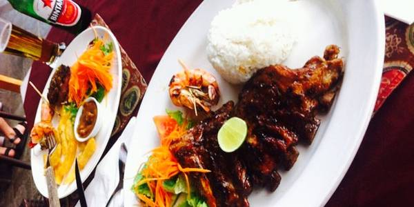 到了乌布自然要吃当地著名的藏鸭饭咯,正好酒店附近就有一家网红店,拐个弯就找到了,过了午饭时间人不多,苍蝇经常飞来飞去。 点了脏鸭饭和猪肋排,基本这边很多店都是主打这两样,鸭子不大有半只油炸的,像是香酥鸭,还蛮好吃的,套餐配有米饭汤蔬菜蛮丰富的。烤猪肋排味道也不错,串串卖相挺好的,海鲜的新鲜度一般,吞拿鱼还是比较粗,一份量还是挺大的。