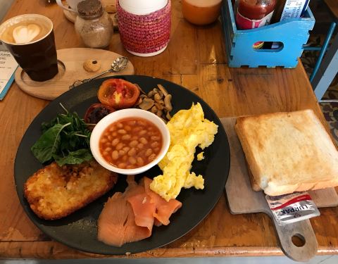 Tasty food, perfect latte. English breakfast here called "big daddy", includes beans, fried tomato, spinach, mushrooms, hash brown, eggs (any style) and salmon or bacon (your choice) + 2 toasts