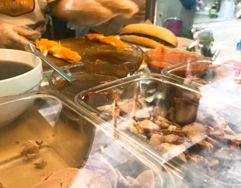 浓郁的法式情怀小铺。切开面包,将秘制的锡纸烤肉放入,铺上清爽的黄瓜和香甜的胡萝卜,裹上当地的虾酱或是沙拉,咬起来面饼的酥脆与烤肉的细腻交织在一起,口感极佳。想一次性品尝不同馅料,还可以选择混合口味。