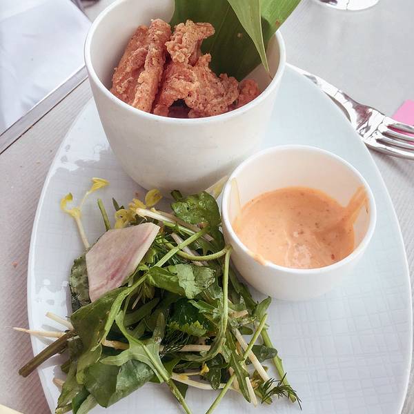 巴黎网红餐厅KONG平时非常旺所以建议大家要提前在网上订位。 整个餐厅像一个巨大的阳光房四周都是透明玻璃,采光非常好非常适合拍照~ 相比起装修来说味道真的是非常普通了,总体属于融入法餐元素的改良日餐,味道不难吃但也并不惊艳。前菜entrées分别为牛肉粒和切丝章鱼 主菜plats是烤羊腿,味增三文鱼和乌冬面 人均消费50欧左右