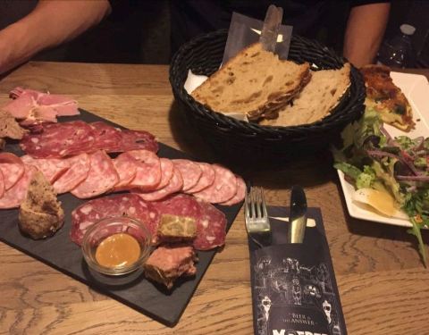 这家的啤酒是自己酿制的,所以很受欢迎,主要是啤酒新鲜,然后叫了一盘火腿,吃啤酒很爽,类似于国内的烧烤配啤酒,主食有全麦面包哦。