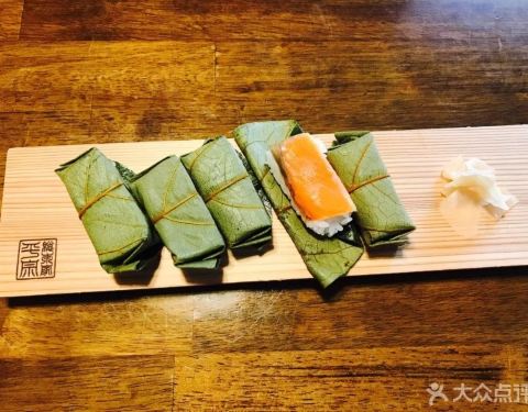 柿叶包裹着寿司,口感香糯。摆盘精致,很是赏心悦目。假若打包带走,包装也很精巧哦。因为外层是柿子叶包裹的,寿司还带着些柿子香味,别有一番风韵。
