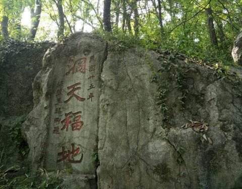 从玉皇山北麓的林海亭拾级而上,不出十分钟就可到达老玉皇宫。老玉皇宫环境清幽,殿宇轩昂,飞檐翘角,金碧辉煌,香火也非常旺盛。 走进老玉皇宫,左侧便可有乾坤一望四字石碑,在洞天福地石刻一侧还有古藤,差不多有百年树龄。