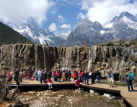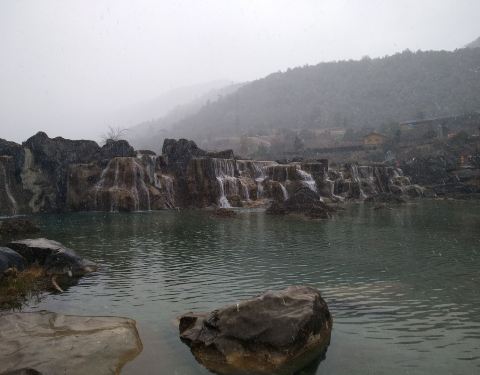 在这里处处都是美景,犹如人间仙境这里的水没有蓝月湖和玉液湖的水蓝,但是,清澈见底,伴着瀑布的涛声,遥望着远处的玉龙雪山,也是令人陶醉的。在这里处处都是美景,犹如人间仙境。