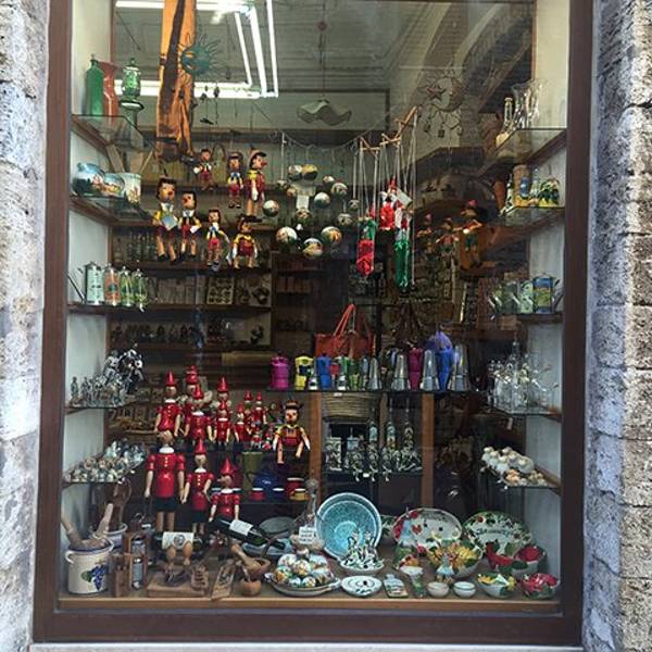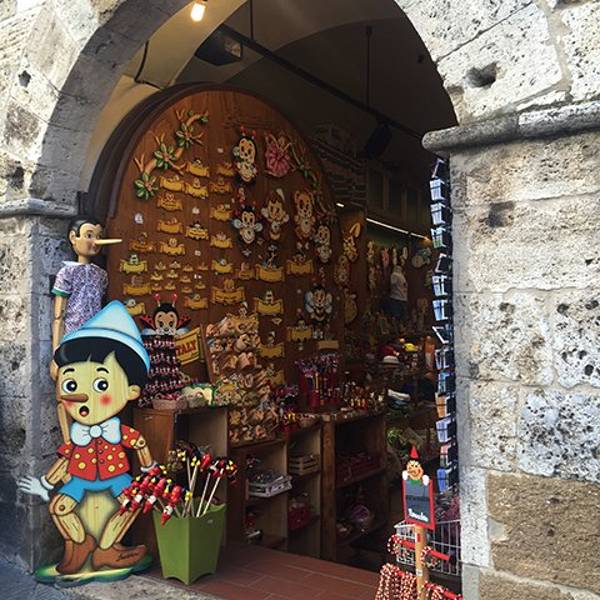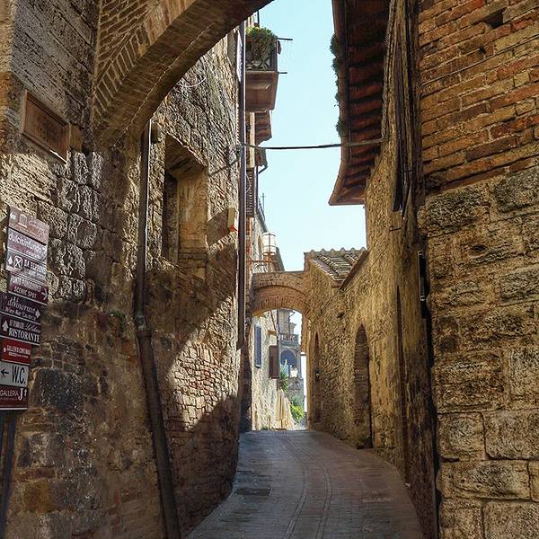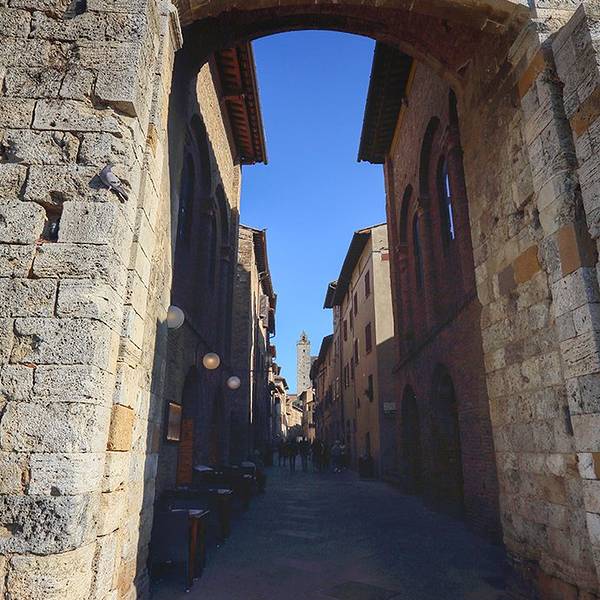 从巴士站步行几分钟便可到围城的城门Porta San Giovanni,这是始建于1262年的城门,顺着城门即可进入San Gimignano,由于我们到达的时候还比较早,没什么观光团,所以走在路上很舒服~~可以任意拍照~~~一路上两旁都是好几年百年老房子,原汁原味的保留了中世纪风味,现在都被用作贩卖纪念品的小店,意大利真的非常适合买买买,这里可不单止说购买奢侈品,还包含买各种各样有趣好玩的纪念品还有食材。随时让人剁手的节奏啊~~~路过烟草店,先买好到锡耶纳的车票。然后继续前行,前往水井广场。