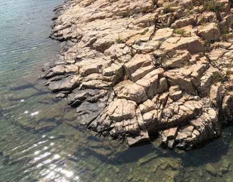 可以清晰看到岸边流动清澈的水。水库下有一块空地,像湖心岛,