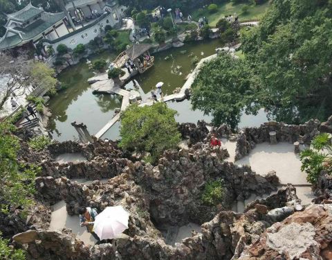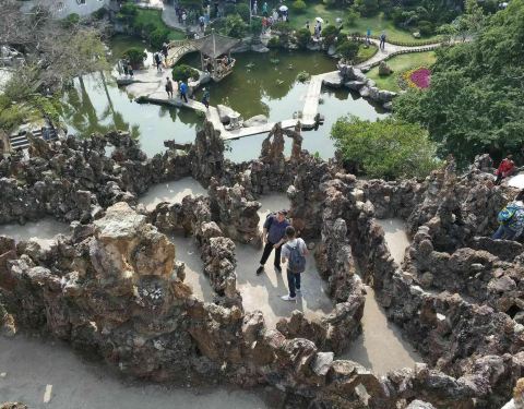 十二洞天是用多色的砂岩、亘岩、砾岩等垒叠成的假山,分12个洞室,分别以12地支编列序号。仔细看,能发现石头做的十二生肖的身影,整个假山上下盘旋,曲折迷离,所以又被称为迷魂洞。