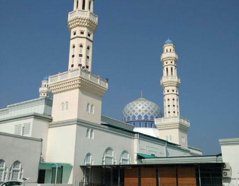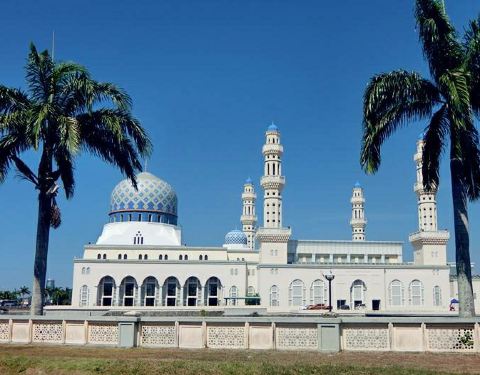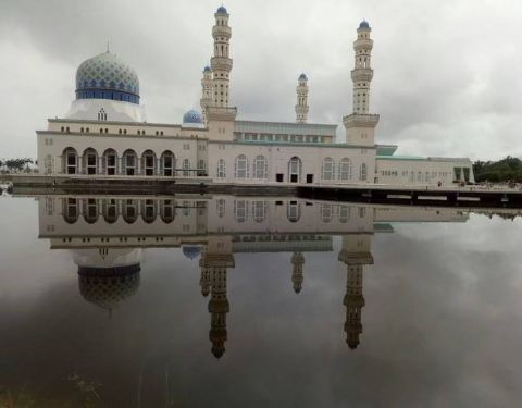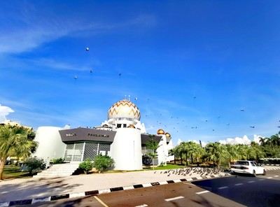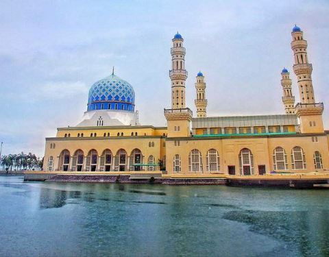 该景点巍然耸立在市区内,距离沙巴州博物馆不远。整个建筑由16座小穹柱围绕魁伟金身穹顶组成,建筑风格糅合了现代和传统元素,庄严华丽,很有气势。建筑外墙是鸽灰色的并镀上18K金,大厅可容纳5000人聚礼。另有女性专用的阳台,可容纳500人。它是教徒祈祷的宗教场所,游客参观必须从正门进入,穿着需得体,门口有租借长袍服装,脱下鞋子之后才能入内。一楼中间有个水池,以这个水池为基准,向外扩散的天井式设计。内部大理石地板的原料来自意大利。内部的建筑设计也像几何图形般,楼梯、扶手、天花板处处有菱有角。二楼是男生的祈祷大厅,空间不大,但却非常的庄严肃穆。尤其中间悬吊的那盏水晶灯,华丽但却神奇地融合在这个沉浸的空间里,阳光透过周围墙壁上的几何图形空隙洒落。在这个空间里,有种让人烦躁的心情顿时沉淀下来的神秘力量。