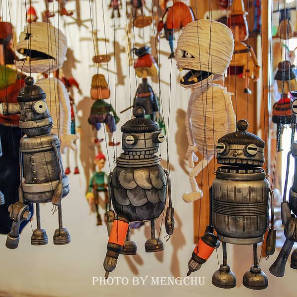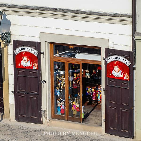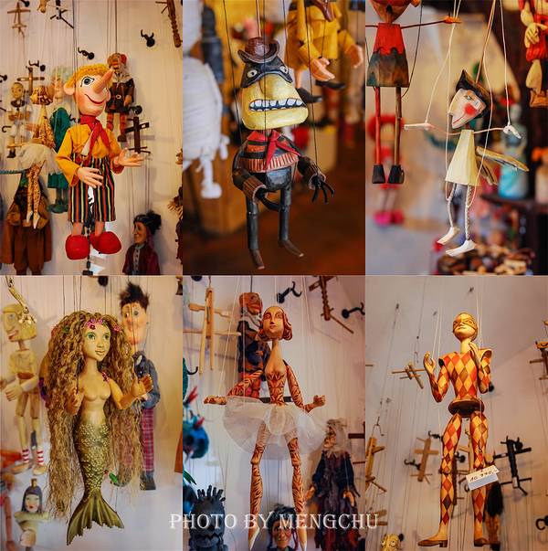 逛完小城区和老城区,布拉格已经没有什么需要打卡的景点了,而真正的布拉格之旅才刚刚开始。在这座美丽的城市里,本就应该忘记地图和一切攻略,随心所欲的走走停停逛逛,忘了自己在哪儿,忘记自己是谁。从小城广场溜达到伏尔塔瓦河畔,有成群的野鸭和天鹅,刚好手头有早餐吃剩的面包,蹲在河边与这些鸟儿嬉戏。面包屑一扔出去,哗啦啦地就聚过来一群水鸟抢夺食物。玩上了瘾再去买个面包来接着喂,虽然Candy极不赞同我这种败家行为,仍拗不过我陪我喂了大半天。沿着伏尔塔瓦河继续走,从查理大桥桥下穿过,却意外发现了两家超赞的木偶店。因为要帮朋友带两只提线木偶,这一路也逛了不少家店,几乎都大同小异。而这两家店提线木偶的精巧程度,简直可以用艺术品来形容了!捷克大部分木偶店在售的木偶,多是泥塑材质的,简单说来,就是把材料灌入模具中定型即可,便于量产,专门打发游客,这类的木偶依据大小不等价格大都在2000kc以内。稍微精致一些的,木偶的头部和手脚都是泥塑材质的,躯干和四肢则是木质的,价格大概在1000-5000kc。而真正传统的捷克提线木偶,每一个部位,每一个关节,都是纯木质的!木偶身上的每一刀都足以可见制作者的功力,惟妙惟肖,栩栩如生。这样的提线木偶简直是无价的艺术瑰宝,在售价格5000kc起,高至几十万克朗也不足为奇。留下这两家店的地址以方便后人吧,就算不买,去参观一下也是极好的。