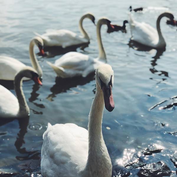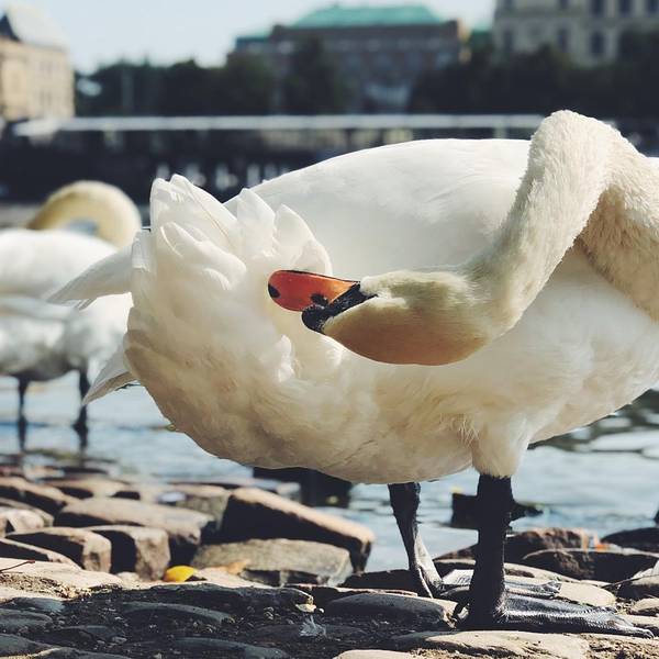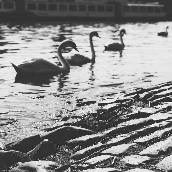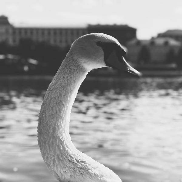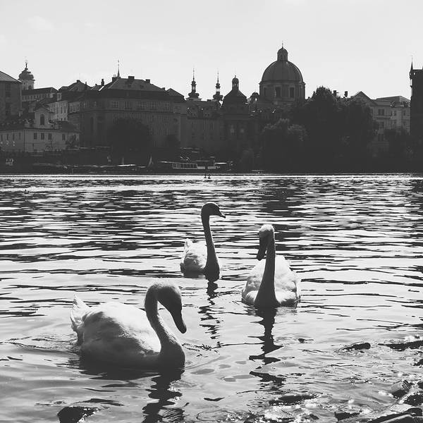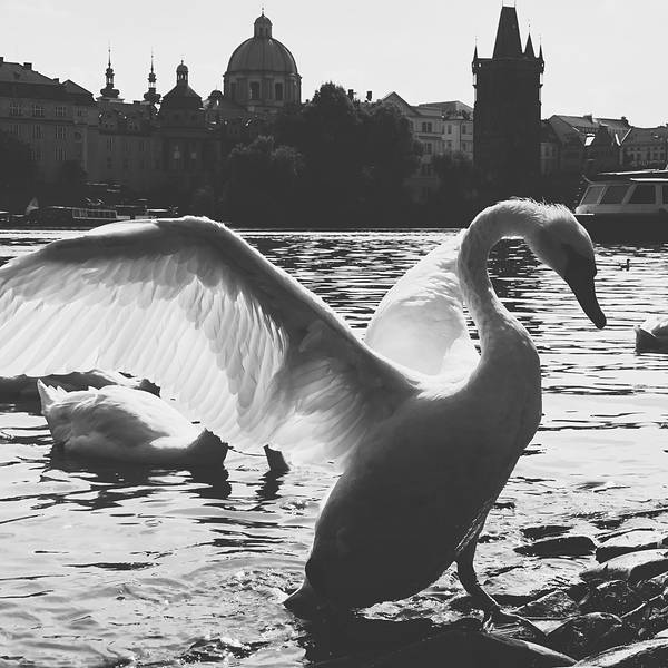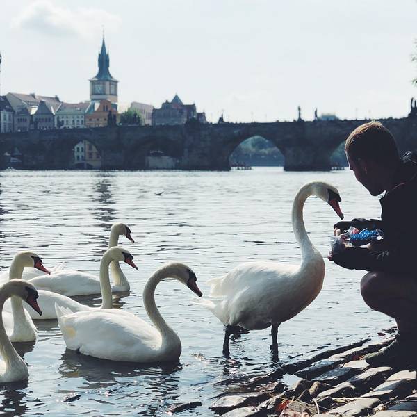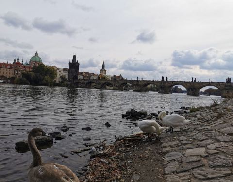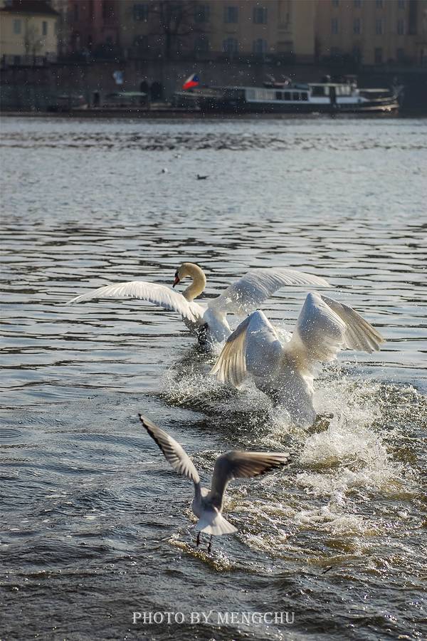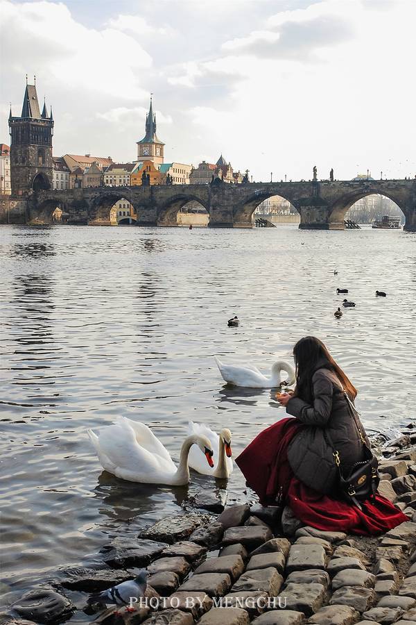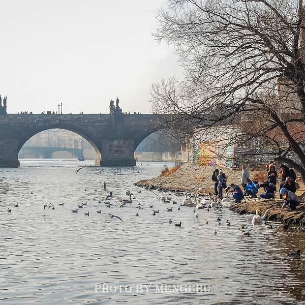 伏尔塔瓦河穿过查理大桥,河边有调皮霸气的天鹅
