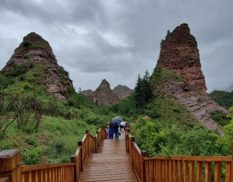 坎布拉以独特的丹霞景观为主,山峰挺拔,雄浑壮丽,充满阳刚之气,极具自然魅力,堪称全国之最,景区内有著名景点瑶池仙境、擎天一柱、点将台、佛手指天等。