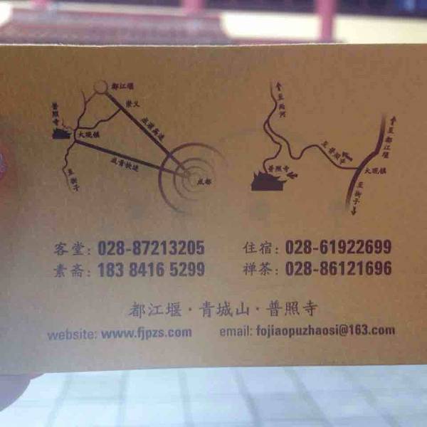 ...上寺庙,栈道旁随随便便都是几百年的楠木,绿绿茐茐,负离子含量别提有多高了,厉害了word普照寺普照寺位于青城山外山,交通:可以从青城山公交站搭乘102(哈哈,注意问清楚是否开往街子古镇方向),在普照寺路囗下车,然后叫辆电动三轮车(5元)就能直达山门。从路口步行至上门大约20分钟左右。 寺庙依山而...普照寺位于青城山外山,交通:可以从青城山公交站搭乘102(哈哈,注意问清楚是否开往街子古镇方向),在普照寺路囗下车,然后叫辆电动三轮车(5元)就能直达山门。从路口步行至上门大约20分钟左右。 寺庙依山而建,从桟道步行上寺庙,栈道旁随随便便都是几百年的楠木,绿绿茐茐,负离子含量别提有多高了,厉害了word普照寺。入门门票全免! 入庙后左手边有尊燃灯古佛,听寺庙义工说,可灵验了,说好多求姻缘的都求到了,哈哈,我没求烟缘,但在佛前点灯了,祈求健康,吉祥。心诚实灵! 寺庙的感觉很青秀,滋场很舒服,件随着尼众的念佛声,我坐着都不想走了!寺庙里有颗1200的桢楠,灵气十足,下面配图,请自行脑补我们的一生有多渺小,的确应该像佛家说的,众善奉行,诸恶莫作…“五观堂”是作为餐厅的地方,中午我们是在那吃的素菜。寺庙还有住宿的酒店,(下面图片上奉上订房热线),住上一晚,第二天清晨还能观摩尼师(女性出家人)做早课,挺庄严的。下面照片还配有些介绍,是寺庙开设给大众的拜忏,禅修等学习,寺庙真的很赞!很赞!很赞!重要的事说三遍。 展开