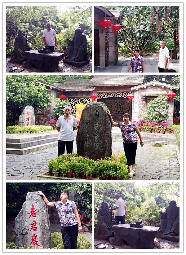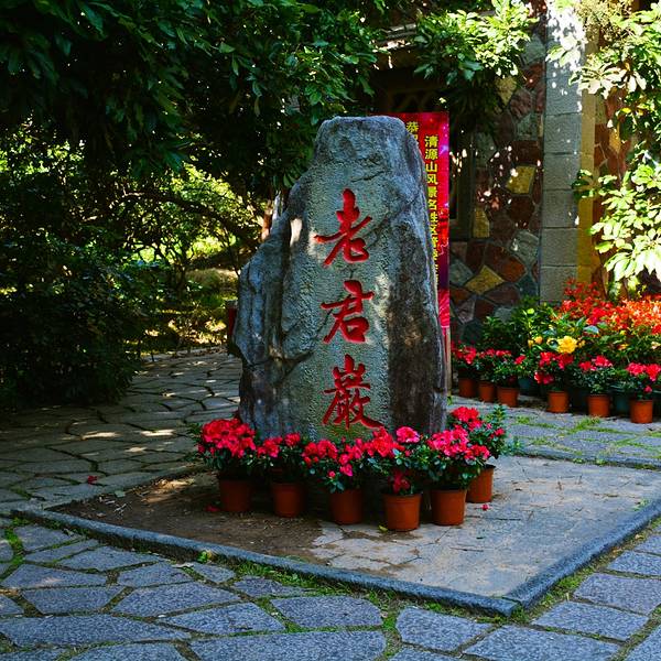 下次与老君合影时,把手伸到老君的耳鼻处,拍哈!老君岩的山门,请大家注意,眼前这曲尺型的上下两级平台,是阴阳太极八卦的变型图案,正前耸立的这方天然石头上镌刻着青牛西去,紫气东来八个篆字,还有这幢以盘根错节为窗饰挂落的石构山门,充满了山野气息,把老子崇尚自然的思想烘托得淋漓尽致,令人有进入物老子姓李,名耳,谥日聃,是我国古代春秋时期著名的哲学家、思想家。