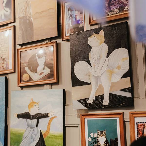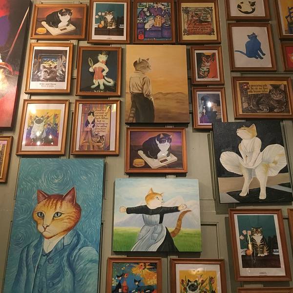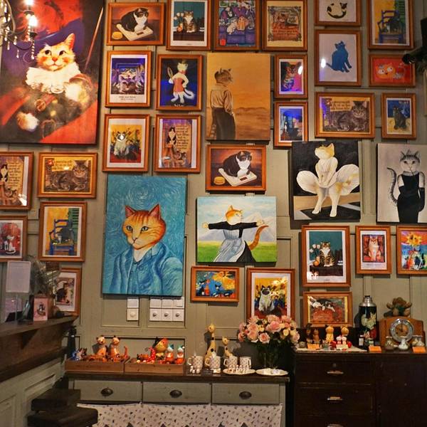 墙上挂着众多猫主题的海报、漫画、油画,展架上摆着馆内自制的形形色色猫主题的布艺玩偶和摆件,随处可见以猫为形象,以各式各样物品为载体的绘画、雕塑、涂鸦等艺术作品。