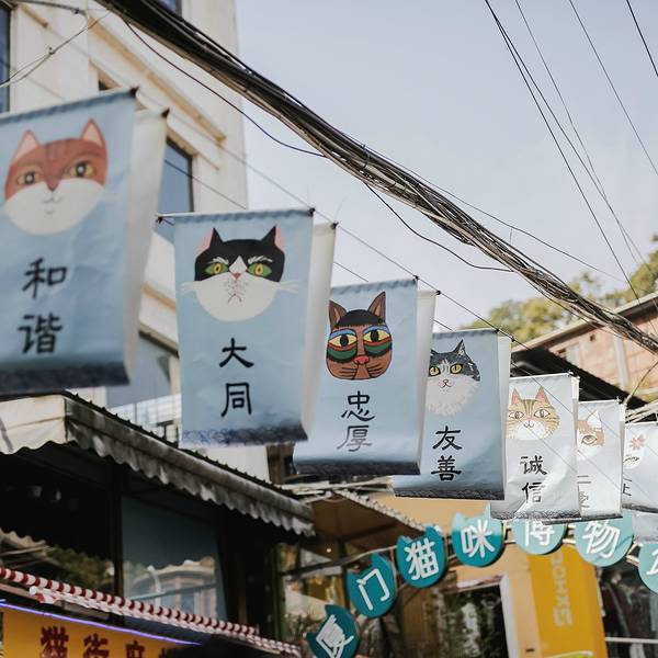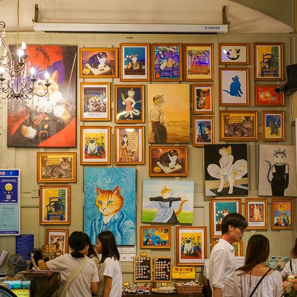 猫街之名名副其实,周边的一应商铺几乎都做成了猫咪主题的,里面各类猫主题相关的趣味商品遍地都是。就连很正能量的宣传语,也做成了各式猫咪的横幅,远远看去十分有意思。一位很帅气的小哥哥正做着手工,恩吉看中了其中一款手工包。好,买买买!恩吉隔窗观看的几只猫咪,高冷的它们估计早已对游人的惊呼声见怪不怪了吧。玛丽莲·猫露和奥黛丽·猫本沿着猫街往下走,就来到了艺术者的天堂——沙坡尾,而沙坡尾中要论最文艺的地方,当属艺术西区了,每年吸引着大量的文艺范儿的男男女女。我们还没进去,就能感受到浓浓的艺术味扑面而来。有种预感,恩吉会很喜欢这个地方。 展开