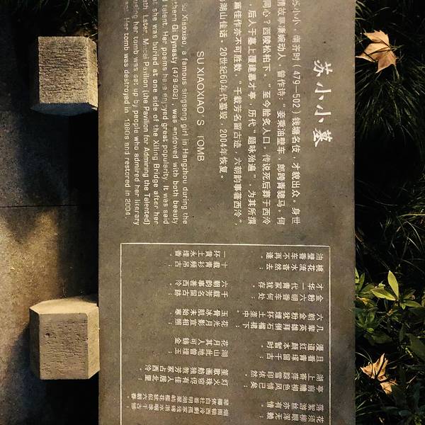 湖山此地曾埋玉,花月其人可铸金!这座西泠桥畔的衣冠墓就是苏小小的一生最好写照!苏小小,南朝齐时期著名歌伎、钱塘第一名伎,常坐油壁车。历代文人多有传颂,唐朝的白居易、李贺,有文学家认为苏小小是“中国版的茶花女”。她自小能书善诗,文才横溢,但不幸幼年时父母双亡,寄住在钱塘西泠桥畔的姨母家。她虽身为歌妓,却很知自爱,不随波逐流。苏小小十分喜爱西湖山水,自制了一辆油壁车,遍游湖畔山间。一日,沿湖堤而行,邂逅少年阮郁,一见钟情,结成良缘。但不久阮郁在京做官之父派人来催归。阮郁别后毫无音讯。最后郁郁而终!苏小小同情书生鲍仁的贫困遭遇,慷慨解囊,资助他上京赴试。后苏小小受人陷害入狱,身染重病,临终前,姬向身边侍候的人嘱咐道:“我别无所求,只愿死后埋骨西泠。”应试登第的鲍仁后来遵照苏小小“埋骨西泠”的遗愿,就出资在西泠桥畔择地造墓,墓前立一石碑,上题“钱塘苏小小之墓”。