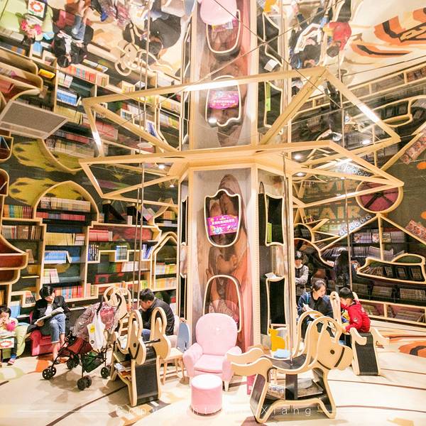 杭州是个多元化的现代都市,流传千古的白娘子传说让它富有浪漫,吴越和南宋让它拥有2000多年的历史文化,今天我要说的是杭州也是一个文艺之城。其实去年来到杭州的时候就听说这里新开业一家比较特殊的书店:钟书阁,但是由于时间原因没有来得及去欣赏一次,所以这次来到杭州一定不可错过。杭州的钟书阁位于滨江区星光大道一个半开放商场的二楼,其实来到会很轻易的找到。整个书店的面积有1000多平方。室内的设计延续了钟书阁自有的特征,天花板都铺上了镜子,使得空间处在一系列对称和变幻中,看起来充满了魔幻般的色彩。书店的整体空间被划分成4个区域,靠着二楼走廊边是一个纯白色空间,书架被做成一根根散落在大厅内的柱子的样子,和书店“森林”的主题相对应,这里是为读者展示新书和推荐书的地方。不过钟书阁与其他书店不同的就是在创意上,内部的书架围绕着四周的墙排列,中间留出来的空地摆放了一串桌椅,从不同角度看都呈现出左右对称。在镜子里反射出魔幻的图形,这里的深色调与纯白色的空间产生强烈的对比,也给人不同的视觉冲击。这里可以让成人流连忘返,自然也有孩子们的世界。儿童的区域更加富有特色,犹如一个室内的游乐园。旋转木马,过山车,在这里都成了阅读和嬉戏的道具。色彩和整个布局让临走时的我都有点难以迈开步伐,不过唯一的缺点是,孩子们的声音还是有点大,多少会影响旁边阅读的他人。钟书阁的第一家泰晤士店于 2013 年开在上海松江大学城附近,而这里是杭州的第一家。在很多人的眼里钟书阁的风格略显夸张,让很多阅读书籍的人们觉得这里有了一丝的耀眼。但是现如今更多的创意店给人们带来了不一样的选择和想法,任何的阅读之心还是归根自己。