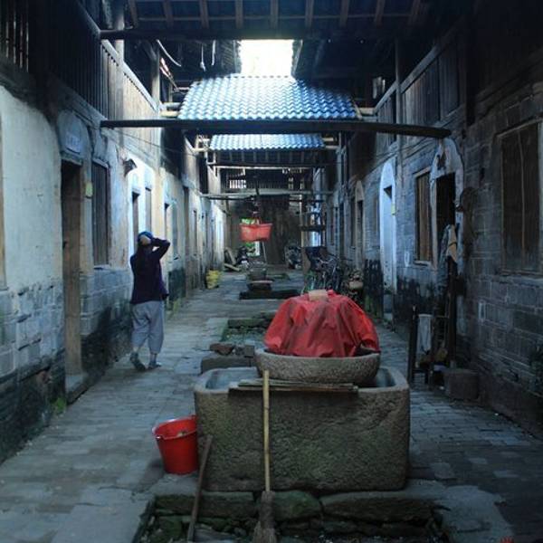 南庐屋为典型的客家天井式砖木建筑,五进厅堂,两层结构