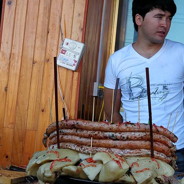 8.8,坐着火车游新疆,还是双层的旅游专列,这很可以,哈哈~双层旅游专列上的枕头新疆和北京有着两个小时的时差,所以,北京时间的六点就是新疆时间的四点,下图是伊宁新疆时间四点钟的样子。这一天里认识了大安妹子,除了睡觉,就只剩下吃了。。。1元1公斤的西瓜,在伊宁的日子里一天一个,用勺子挖着吃,爽歪歪手工冰激凌,一碗5元,1个球1元钱 话说卖冰激凌的小弟弟贼帅,长长的睫毛,大大的眼睛,立体的五官,脸皮厚如我也还是没好意思拍照市场里的羊肉串,分肉块的大小算钱,我买了5元一串的大安心念念的烤鱼,卖鱼的小哥哥还主动让价~~请重点关注吃的哈,忽略我偷拍时老板略带忧郁的眼神~~烤包子路边的野果子青旅里的苹果树,美女老板人很好,随便摘~青旅苹果树上摘的苹果 8月初的苹果还是带着一点点酸涩的呢