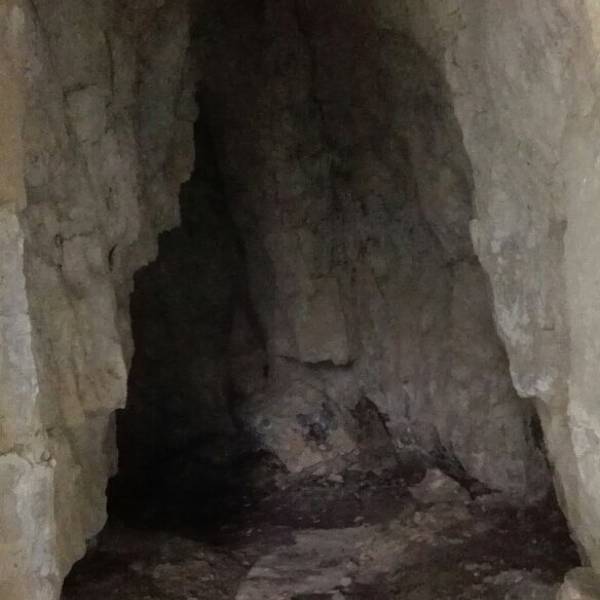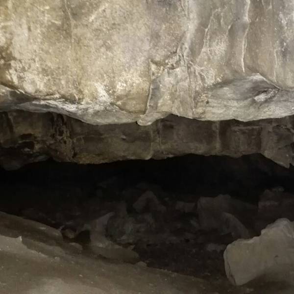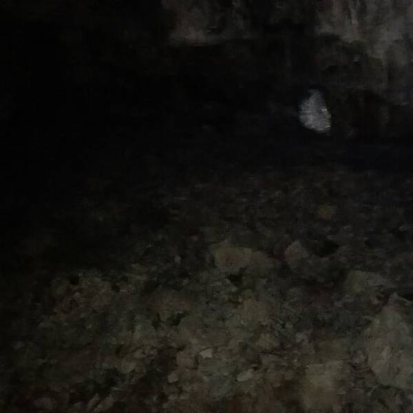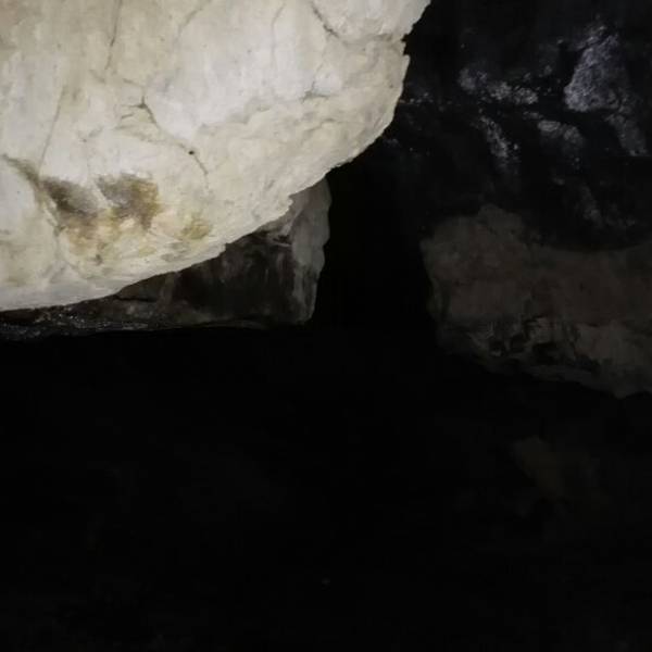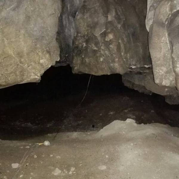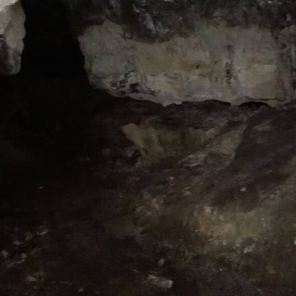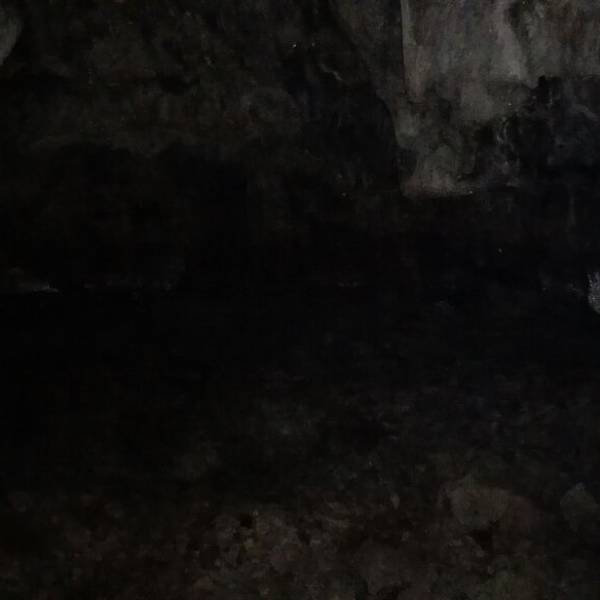走没多少路右边出现一个洞,地图上叫王爷洞,地上稍有点泥泞但不像有水道,把手机电筒打开走进去,约十几米后左转(里面很黑了,手机电筒也就两三米的能见度)往里再走,走一段后空中吊下一片巨石,左边的到我胸部左右,右边的离地只有二十多厘米,仔细观察了下偏当中两块巨石间斜右向有条缝隙,我比较瘦可以直立侧身穿过去,而脚下泥土上刚才就有的一根长电线也在延伸,往前一点依稀看到前方应该是近十平方左右面积泥堆坑(这如果是沼泽地千万别踩,陷进去尤其是一个人时非常危险),周围都是黑乎乎的石壁似乎到头了,右边的巨石和地面间高度很低,手机电筒照射距离有限所以只能观察到这个地步,再小心地转身返回穿过巨石间的狭缝走出洞。