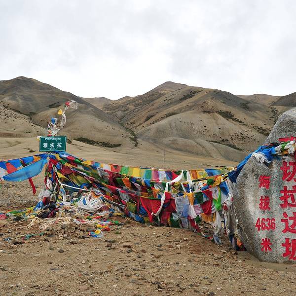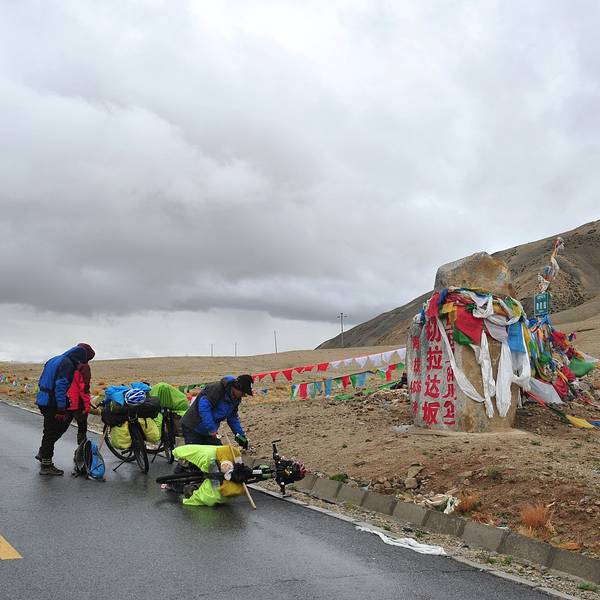 雨雪雾中经过海拔4636米的雅切拉达坂,几位骑行的年轻人在此整理行装。
