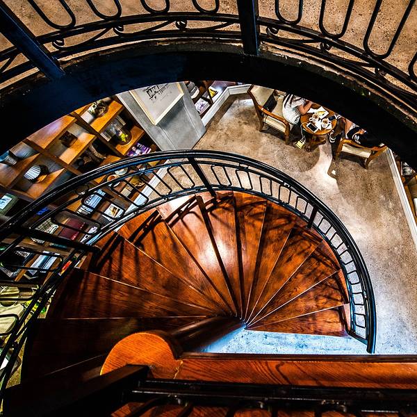 奥布朗咖啡馆的黑色旋转楼梯雨还在下,且没有停的意思,于是我们在奥布朗咖啡馆坐下来喝点儿东西。