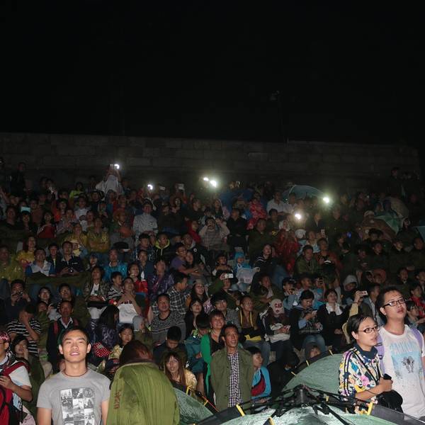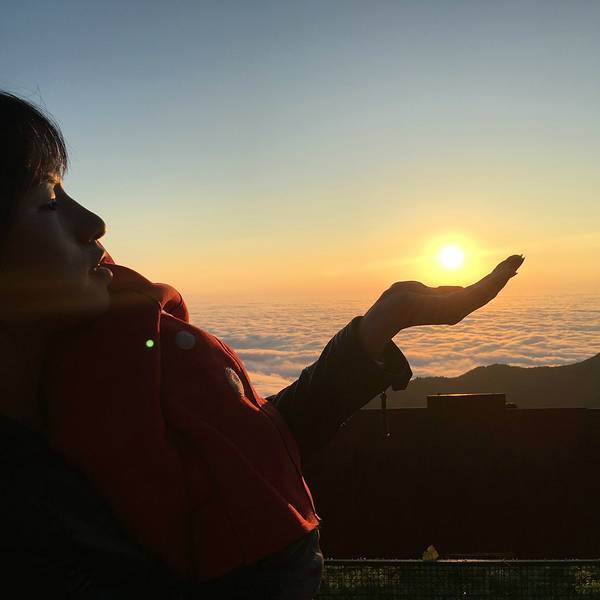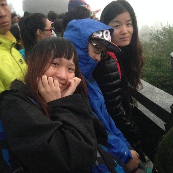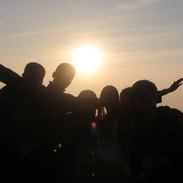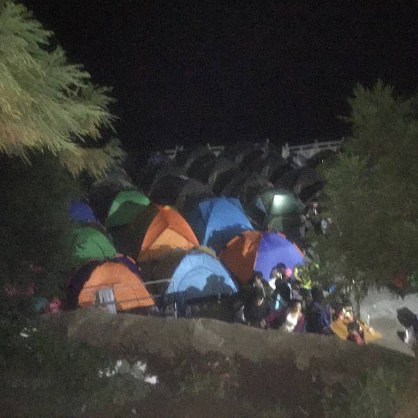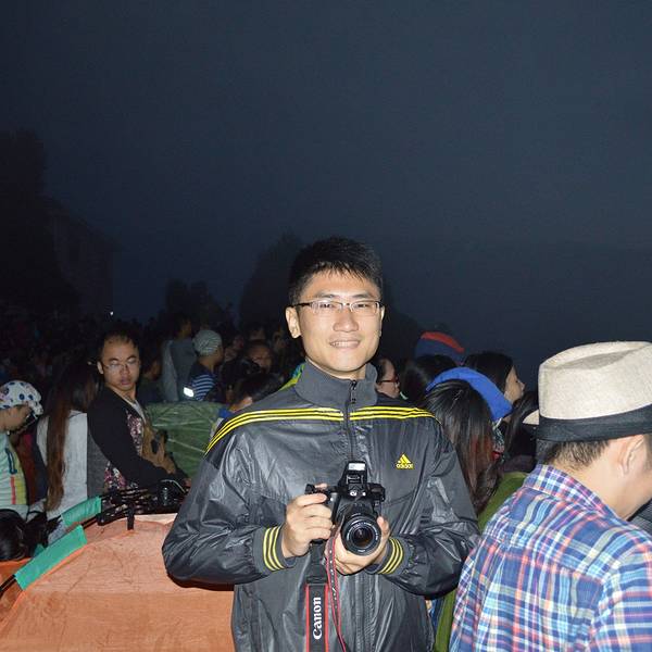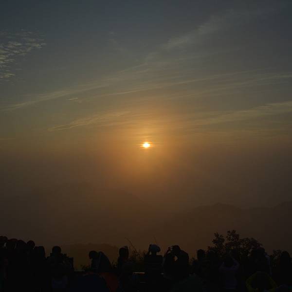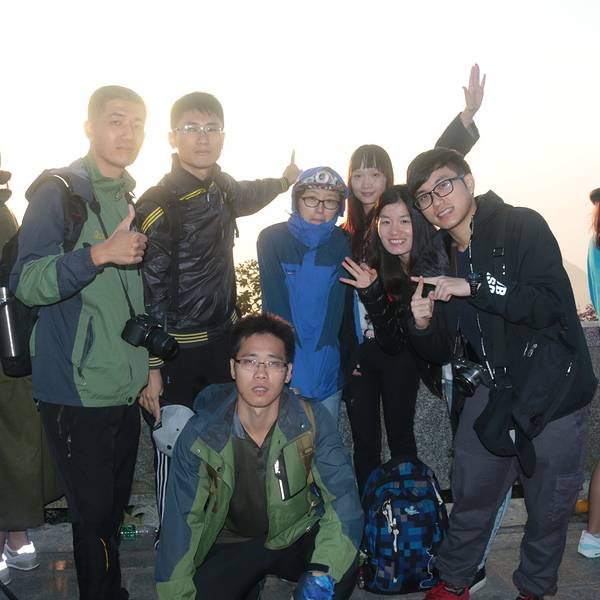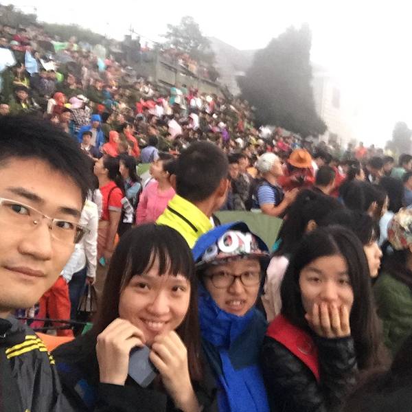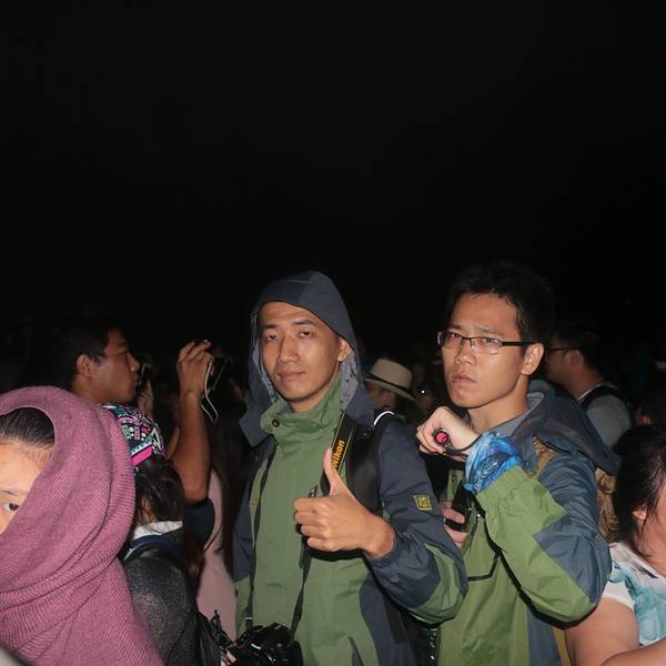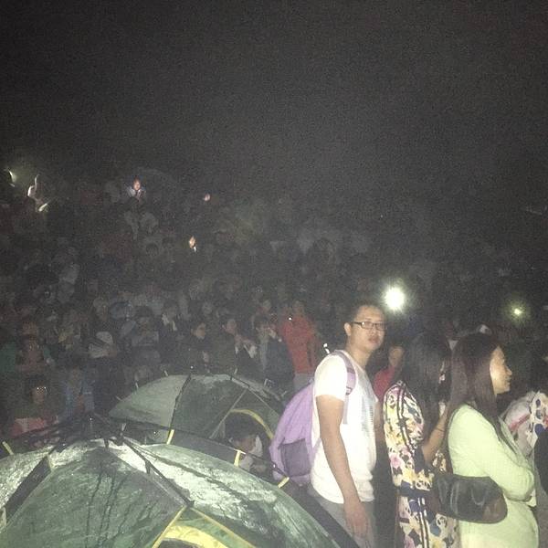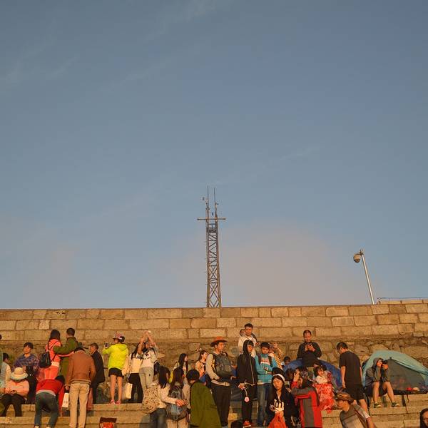 到了望日台的路口,我们等到了徐大,互相诧异后,徐大和小蝶先走。没想到杰少一会也赶到了。所有人终于汇集到一起。到望日台的台阶不宽,都是人。大家慢慢的挪动着。 望日台已经人山人海,地上还有很多帐篷占去了很多地方。好的位置早就被其他人霸占了。我们好不容易分成两拨人,站到了比较靠前的位置,开始等待日出。