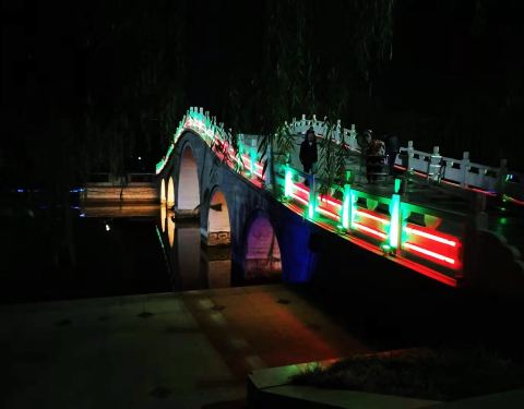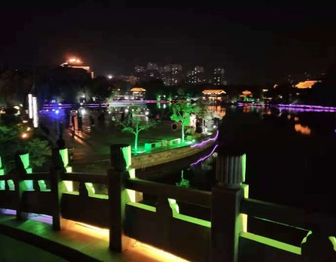 然后夜景不错。有湖水 书院,还有很多人逛公园,跳舞的,恋爱的,还有很多人赏夜景!德州董子园,晚上去的