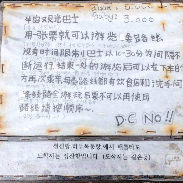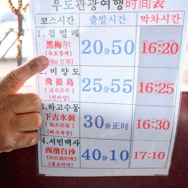 ▿▿▿环岛巴士 观光巴士的发车间隔为10-30分钟不等,每个景点的旅行时间大概是20~40分钟左右。在最后一站司机要回收小票,车挂红色牌子的才能到下个景点。其实大家不用担心不知道哪里乘车,看到很多人群的地方或者问一下游客就知道啦。 之前看攻略部分驴友说观光巴士有5个景点,包括牛岛博物馆。我们是17年3月到牛岛了,只有4个景点哟。
