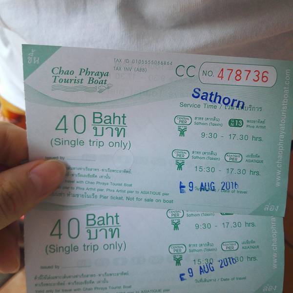泰国的船有不同的颜色,代表不同的航线。 到了码头之后本来想坐当地人坐的船,毕竟价格更便宜,结果一眼就被看出是游客。 工作人员热情的告诉我们怎么买游客船去哪里坐,一路指引,热情到我根本没办法混进当地人里。。 于是就上了一车外国人的船,一路上有讲解,然而我听不懂。 这是船票。