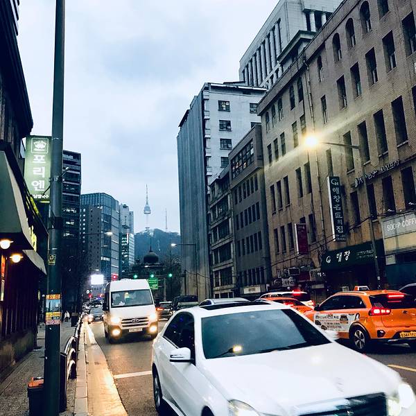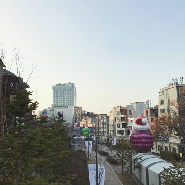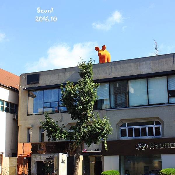 开始也多少会担心一下,十一假期的机场会不会人超级多,所以出门还是挺早的,但是看到这空空如也的景象,还真是惊喜呀! 走你~弘大站下车之后,竟然也是如此空荡~明明行前大家都跟我说十一期间来首尔会被挤死哒...都劝我说别十一期间来。但是机智如我~这趟走下来,除了明洞人比较多,其他我去的地方,基本都没什么人,所以和我一样只有十一有时间的朋友也不要怕,其实人多人少还得看你去的是哪儿,我想即使不是节假日明洞也会被我国人民挤爆的吧...高兴地来拍一张~担心我冷不冷的各位,十月初的首尔还挺热的个人认为,不知道是不是我火大,反正这样穿还热呢,雪姨则全程大外套哈哈,仿佛两个季节~ 好啦~放下行李,先去梨泰院换些钱,据说这里的汇率最好~我去的就在梨泰院地铁1号出口附近。这头楼顶上的蠢猪也是萌到我了~即使是在马路对面,我的雷达也感觉到了这是家不错的咖啡店~