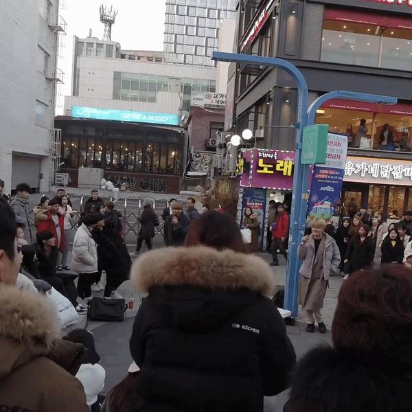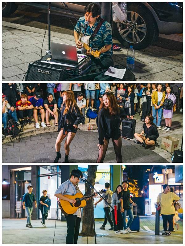 弘大周边充斥着年轻荷尔蒙的气息,青春荡漾。在这里汇聚着各地美食、适合拍照的咖啡馆、 韩国 独立设计师品牌潮店、 韩国 年轻人最爱去的Club,可一站式享受着购物、游戏、艺术、文化的乐趣。每一间小店都值得逛上一逛,每一间书店都值得拨弄两页,每一间甜品店都值得品味两口,这像回到了大学生的生活,整天嘻嘻哈哈,无忧无虑。现在能做到的,也只有 泰山 了吧。弘大的夜晚,整条街都会变成一个大型的公演场地,这里不比 江南 的高大上,处处豪车美女。弘大相对的还是比较接地气的,来往行人多以年轻人和大学生为主,适合寻找青春的记忆。才华横溢的小哥哥,小姐姐在这里尽情舞蹈。围观的人越多,证明场子里的舞蹈越热,在欣赏表演的同时,还要提防着身边口水都要滴到你身上的热情粉丝,难道是,韩流先锋文化外放的一种方式?除了这些劲爆的舞蹈,也有安安静静唱歌的歌手,仿佛可以让人在一片喧闹中忽然安静下来,舒口气,放松一下心情。歌声有温婉,有悲伤,有故事,有动人心弦。还有“想回到过去,试着抱你在怀里 羞怯的脸带有一点稚气......”周董在 韩国 也是有歌迷根基的。 在茫茫人海中,有人能与你共赏一首歌,有人能与你共处一个美丽的画面,温暖自知。