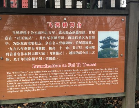 2017年2月初,春节长假后出游。从柯岩回到市区时间尚早,临时决定去越王台。越王台气势恢弘、清静幽雅。景点内除了越王勾践的历史之外,范仲淹也曾在这留下“清白堂”记。越王台旁边就是府山公园,有文种墓和飞翼楼。浓浓的历史底蕴,非常喜欢!