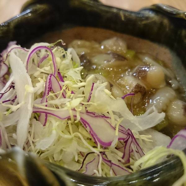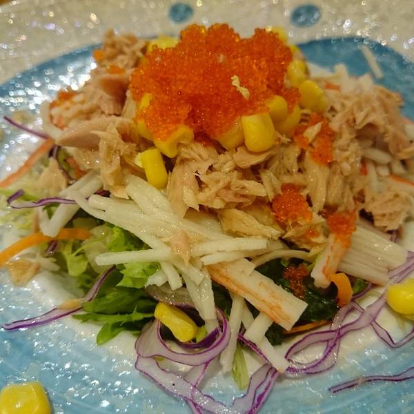 赤熊日料这家店纯粹是为了迁就王主任才来尝试的。 因为武汉小吃倾向面食居多,我这样的肠胃消化功能,一天吃一顿,下午来点甜点,晚上基本吃点小西红柿喝壶茶就能洗洗睡了。这天逛到楚河汉街,天气不好,下车就开始下小雨,就想找家店歇歇脚,看到了大众点评推荐的这家日料店,想着不吃主食,蔬菜沙拉来点也并无不可。于是零零碎碎点下来,一顿正餐就有了。