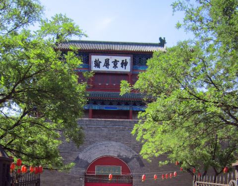 这样曾经的钟楼、鼓楼便重新矗立在了这座古城之中。镇朔楼上还有一块乾隆皇帝御笔的“神京屏瀚”的匾额古城的中轴线上除了南门拱极楼,钟楼清远楼外,还有在它们中间的鼓楼镇朔楼。