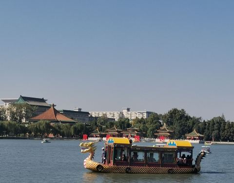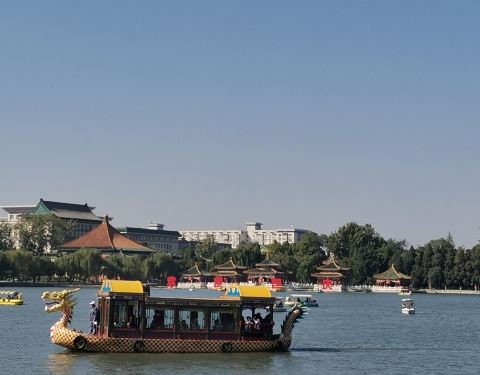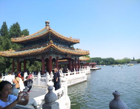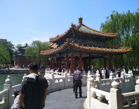 北海公园水面开阔,风景秀丽。五龙亭是五个位于水面上,由栈桥相连的亭子。屋顶覆盖着黄色和绿色的琉璃瓦,彰显皇家的气派和威严。
