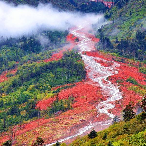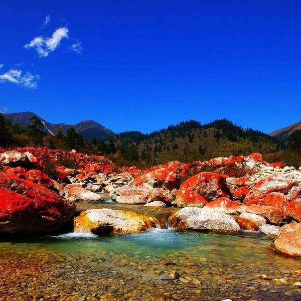 红石滩海拔3300米,这里成片的红石犹如玛瑙般镶嵌在溪沟和丛林之中,专家有两种解释:一是石头中的矿物质含量过高,造成石头、玉或晶体形成红色;生物专家的解释是:红石是花岗石上的一种特殊的红色藻类布满岩石,这种微生物只有空气质量相当好的地方才能生存。