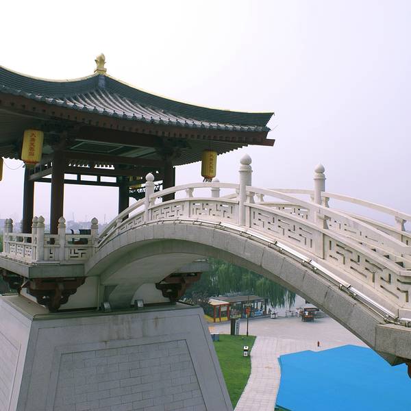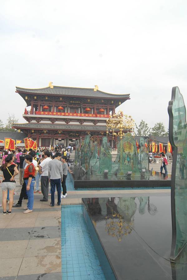 御苑门是大唐芙蓉园的西门,也是正门,造型华丽的两层主门楼与左右紧接的三重阙相得益彰,显得气势恢弘。