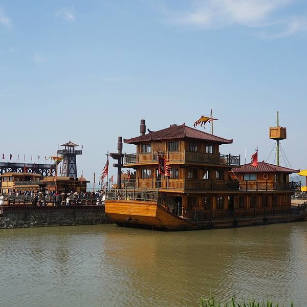 穿过辕门来到吴营码头,这里停泊着当年拍戏用的周瑜指挥船和二十多条古战船,船上焦痕犹在,只是曹操溃不成军、“折戟沉沙”的惨状已成往事。这些古战船经一番修整后,重新发挥“余热”,满载游客驶入烟波浩渺的太湖,一览风光旖旎的湖光山色。游客也可乘上高速快艇,享受风驰电掣的快节奏感觉。