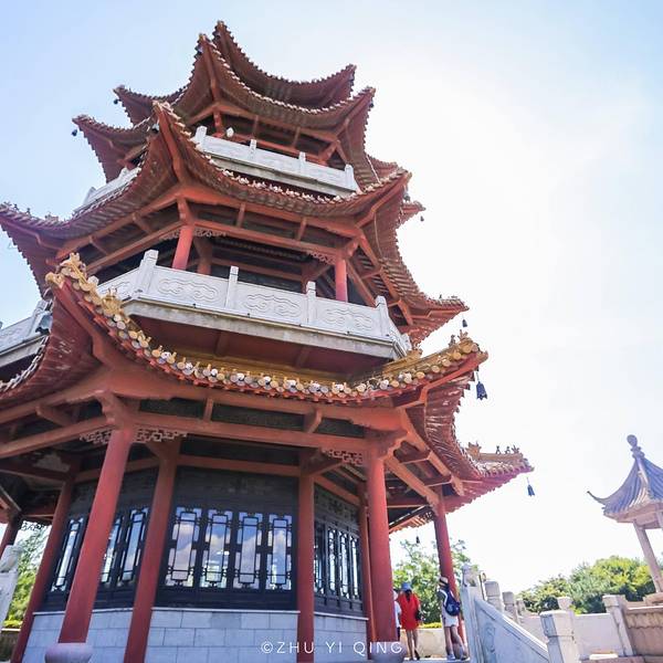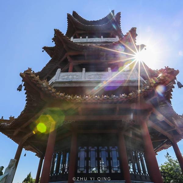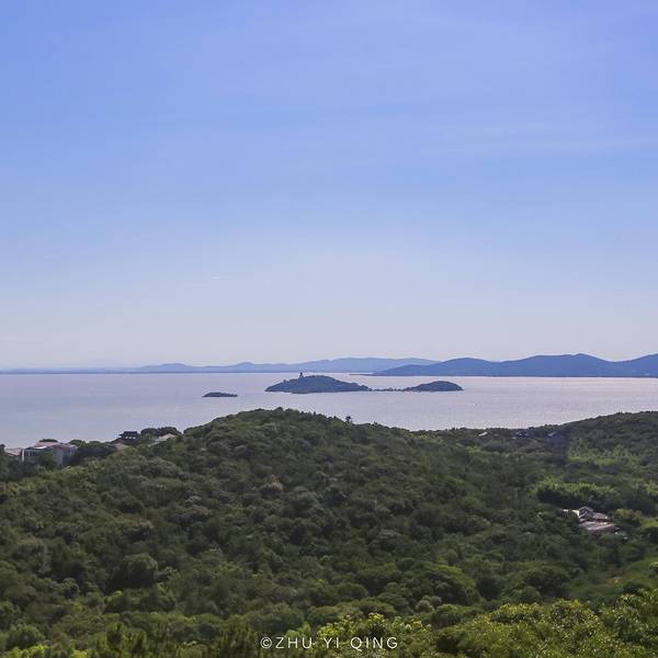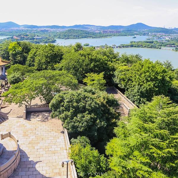我们一直都说太湖很美,那到底哪里才是观看太湖最佳的位置呢?太湖之上有一个非常显眼的建筑,不仅是鼋头渚的地标,更是无锡的地标,这个建筑就是鼋头渚中鹿顶山顶的舒天阁。鹿顶山,是无锡非常著名的“鹿顶迎晖”一景,在鼋头渚充山之东,山高96米,地理位置优越,视野开阔。此鹿顶非彼鹿鼎,鹿顶山原名“六顶山”,但“六”字太过俗气,根据《登鹿顶山》诗,恰巧吴方言中“六”与“鹿”谐音,古时又有吴王好养鹿的传说,所以便改成了“鹿顶”。通往鹿顶山的道路有四条,一般都是通过坐景区导览车经过盘山公路到达,再爬个十来分钟到达山顶舒天阁。从游览车下来后,迎面而来就是四个大字“鹿顶迎晖”,这书法若不是讲解员讲解,还猜不透这字。继续向上到达鹿顶山顶,眼前的这座塔就是泛舟而行时所看到的山上那座小小的塔,名叫舒天阁。舒天阁是鹿顶山的主建筑,坐落在宽阔的平台上,高24米,八角三层四重檐,黄色的琉璃顶在阳光下熠熠生辉。阁顶是黑色镶金的,黑色代表的深沉稳重,更衬托出金光熠熠。沿着旋转楼梯一口气直登阁顶,太湖全景豁然于眼前。眼前,是一幅绝妙的太湖美景图。夏日的阳光洒在湖面上,泛出阵阵金色,开阔的视野让这里成为了欣赏太湖全景最佳的地理位置。极目远望,太湖美景尽收眼底。东南西北,四面都是湖,湖、水、岛、峰,错落有致。虽然江南的天空少有蔚蓝,但似乎炎炎夏日下的无锡,天气格外给力,连对岸的仙岛和无锡城市光景都看的一清二楚,连讲解员都说我们运气特别好。仙岛也称龟岛,因为整个岛的轮廓形似一只趴着的乌龟,所以便亲切地称它为龟岛。沿着阁楼外围转了一圈,几乎处处都像幅画一样。山不在高,有仙则名。生活在风景如画的山里,都赛过了神仙。万顷太湖、十里蠡湖、七十二峰尽收眼底,难怪有人说,鹿顶山才是太湖最美的地方。在鹿顶峰游玩的人不是很多,只有寥寥数人,比起下面拥挤的人群,在舒天阁更可以安静地享受这幅如画的美景。不少游客来到鼋头渚都会直奔源头和太湖仙岛而去,但鹿顶峰,恰恰是欣赏太湖美景最佳的地方。两天都逛不完的鼋头渚,很多人却只去了一天,太可惜!