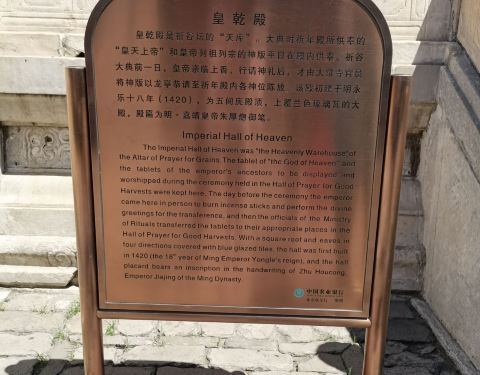 皇乾殿位于祈年殿北面,通过三座拱门与祈年殿相连,皇乾殿建于1420年,其匾为明朝嘉靖皇帝所书,...
